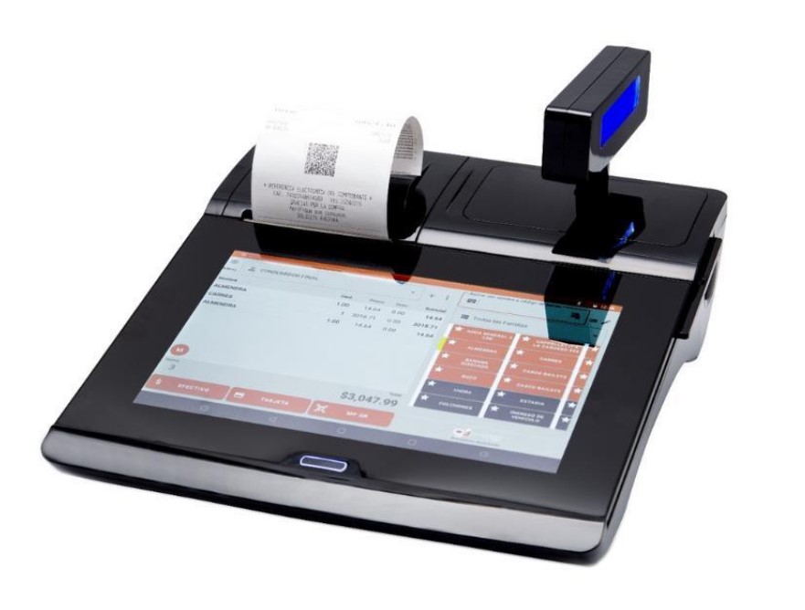 -Pantalla táctil HD de 10”, impresor térmico 80mm incorporado, 150 mm/s, usa rollos de papel térmico de 80 mm de ancho.